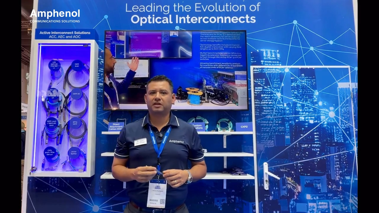 Visit Amphenol’s exciting addition to the portfolio of hyperscale and AI-ready solutions with next-gen QSFP DD that combines linear pluggable optics with PCIe Gen 5.0, adding to the breadth of proven and resilient products known for their hot-pluggability, low power consumption, and high bandwidth capabilities.